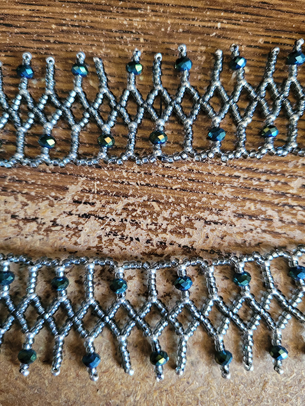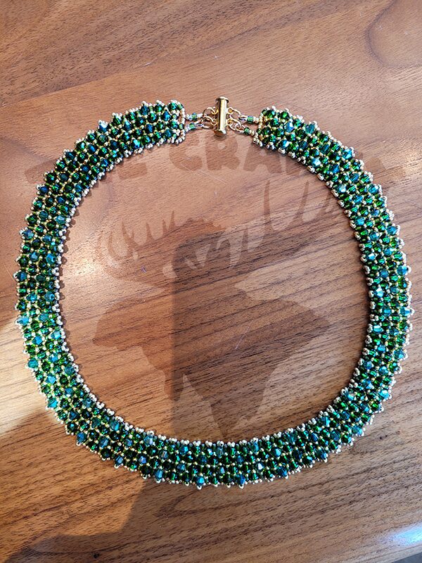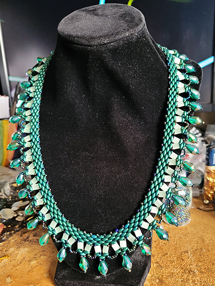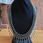 Fashions from the 1920s have always been in vogue, and what better way to channel your inner flapper girl than wearing this sparkling necklace. Made from 11/0 silver-lined translucent black beads accented with 2×3 blue-green iris finished rondelle glass beads. Measures approximately 23 inches (58 cm).